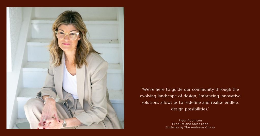As Fleur Robinson steps into her new role as Sales and Product Lead of Surfaces, a division of The Andrews Group, she embodies a spirit of excitement and optimism that is both infectious and inspiring. “This isn’t just a job for me; it’s the beginning of a transformative journey,” Fleur shares. “I see this as an opportunity to redefine our relationship with space and creativity.”